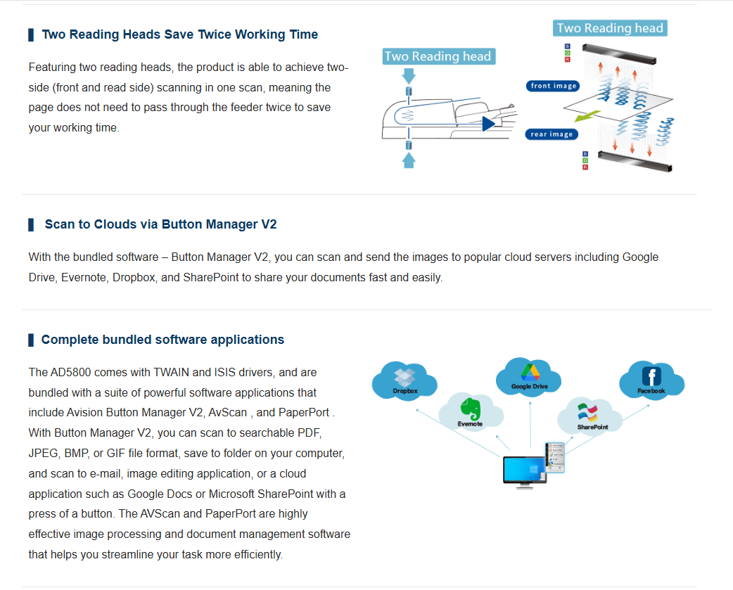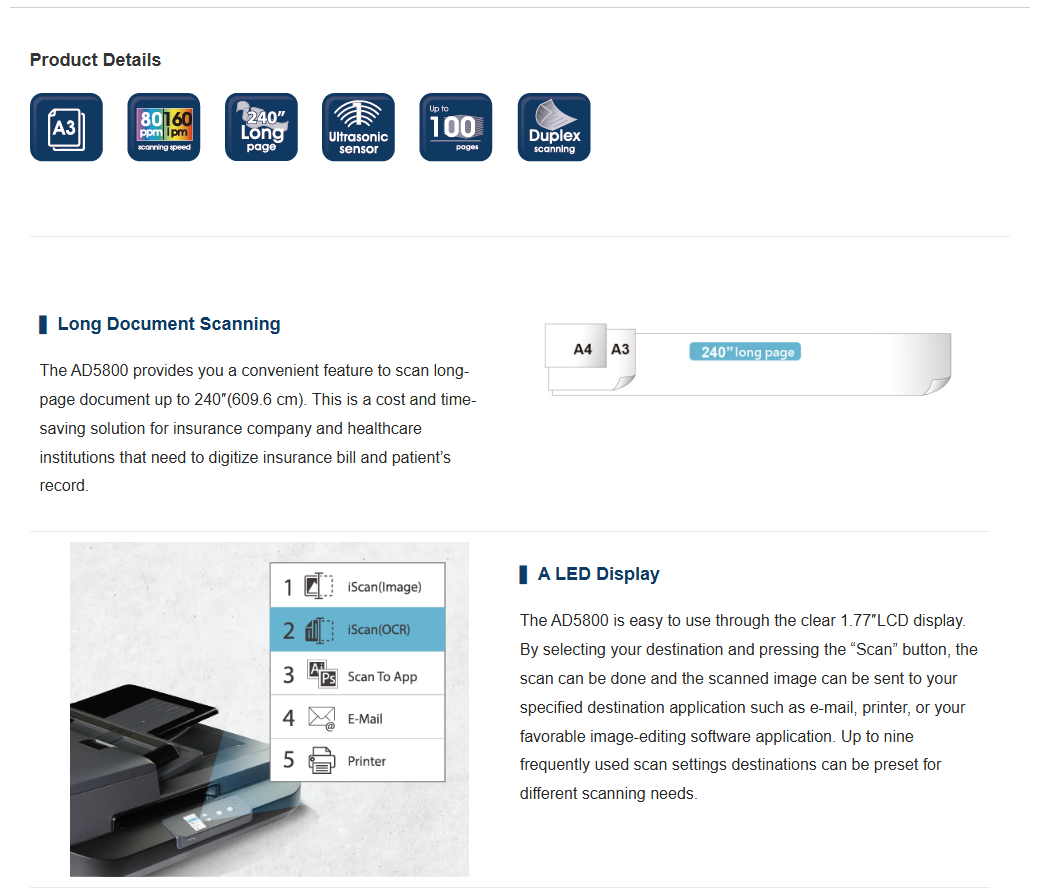 Avision is pleased to announce its release of the high-volume document scanner with a robust 100-page auto document feeder and a blazing scanning speed of up to 80 pages per minute in color, grayscale, and monochrome. Combining the ultrasonic double-feed detection capability, the AD5800 delivers exceptional feeding reliability to maximize your scanning productivity in a small unit.