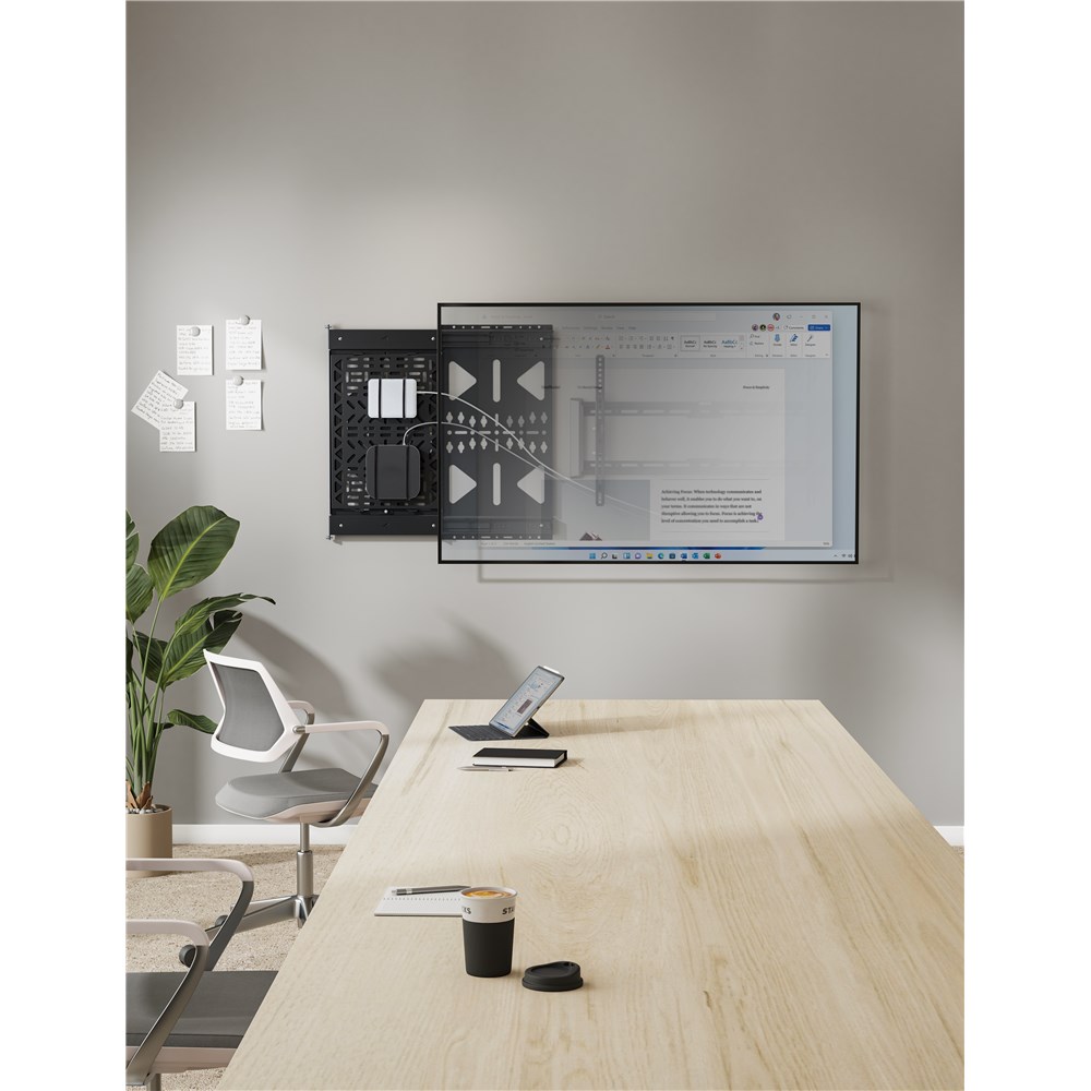 The Arkin AV Sliding Panel (AR-AV-PANEL) is designed to provide a discreet and organized solution for mounting AV connectivity devices such as video conferencing systems, mini PCs (NUCs), splitters, digital signage and media players, plus more. This innovative slide-out AV storage panel mounts behind your screen, keeping essential components accessible while maintaining a clean, clutter-free setup.