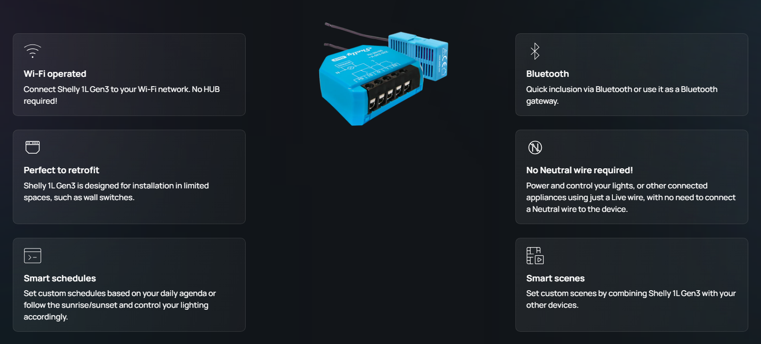 A one-channel smart switch tailored for lighting control in no Neutral wire installations. By simply adding a Shelly Bypass for 1L/2L* in parallel to the load, you can transform your lighting setup with ease!