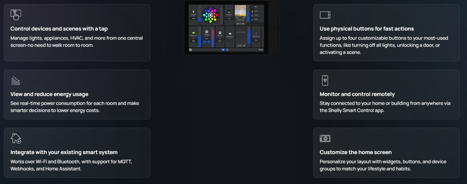Smart home control panel with a 10.1” touch display, built-in relay switching and four customizable buttons. Installs in a standard electrical wall box and gives you full, easy control over your Shelly devices-ideal for houses, apartments, hotels, and commercial spaces.