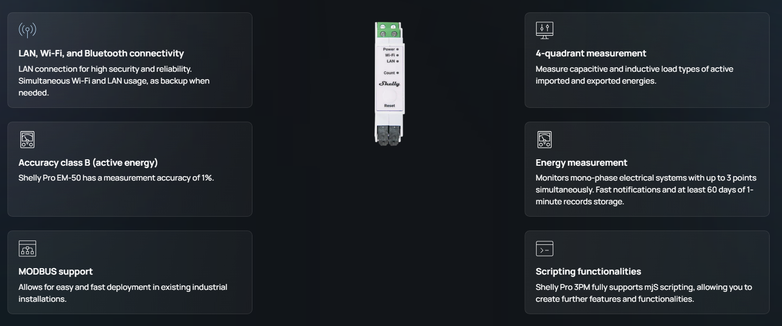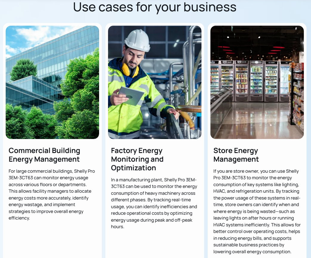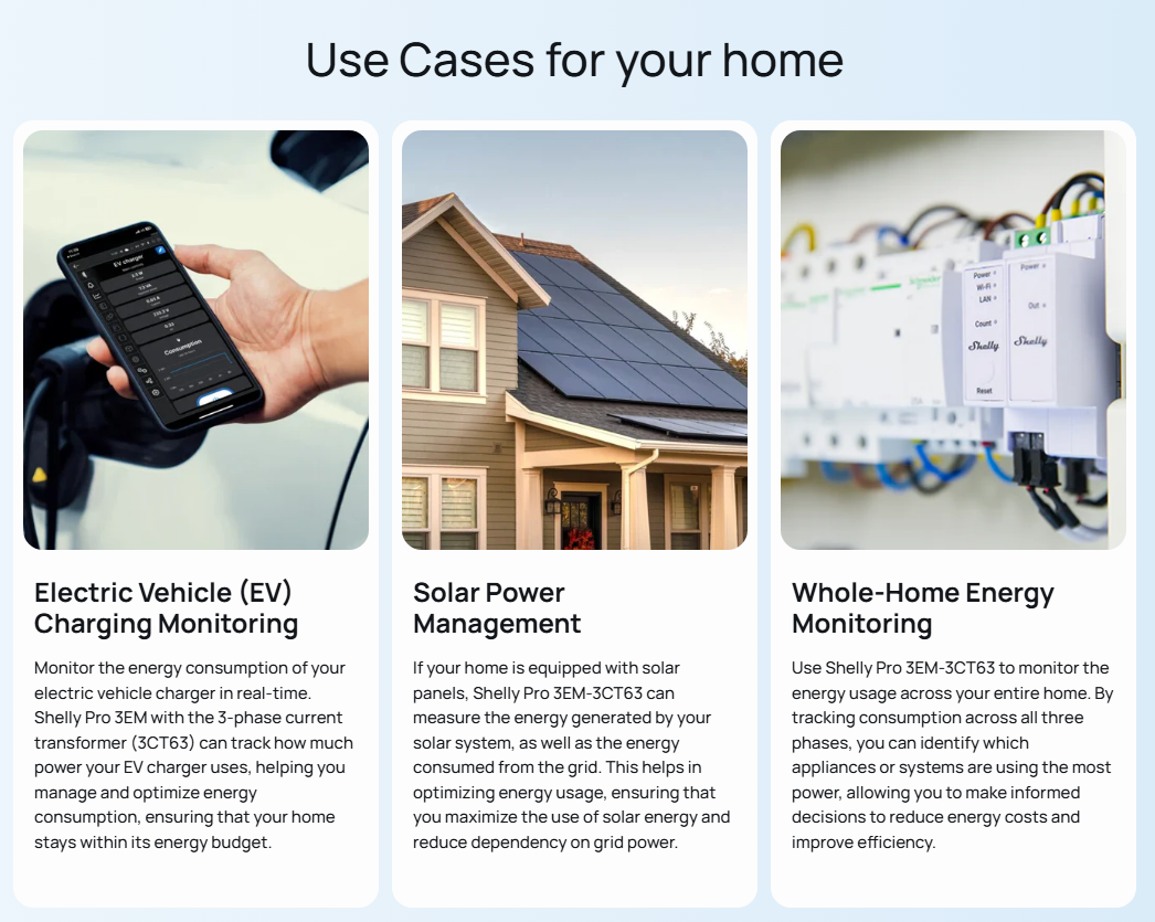 • External contactor control: Loads can be controlled based on device automation or scripts. Available with the addition of the Shelly 3EM Switch Add-on